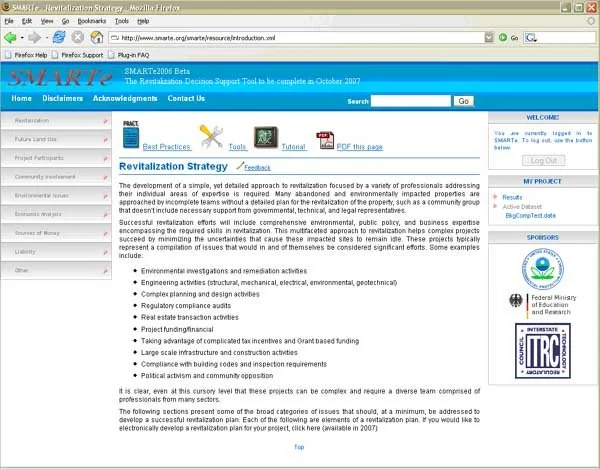 To support sustainable land reuse, Neptune created an open-source web-based decision support system for brownfields that encompasses revitalization strategies, environmental modeling, environmental risk assessment, redevelopment options, economic costs, financing and social costs, and benefits in a holistic system called Site-specific Management and Revitalization Tools—electronic version (SMARTe). SMARTe was built using only open-source web-based tools, so that any potential users are not encumbered with software licensing issues. We took advantage of the unique combination of tools that we have developed (www.gisdt.org) that allows us to combine knowledge bases, expert system technology, statistics and decision analysis tools, and presentation capabilities to provide a truly interactive analysis of brownfields problems. SMARTe allows users to engage at various levels of complexity depending on their interest and takes a holistic approach to decision making for brownfields sites. Our software tools facilitate defensibility, traceability, and transparency. Quality assurance is promoted through internal testing and user feedback.